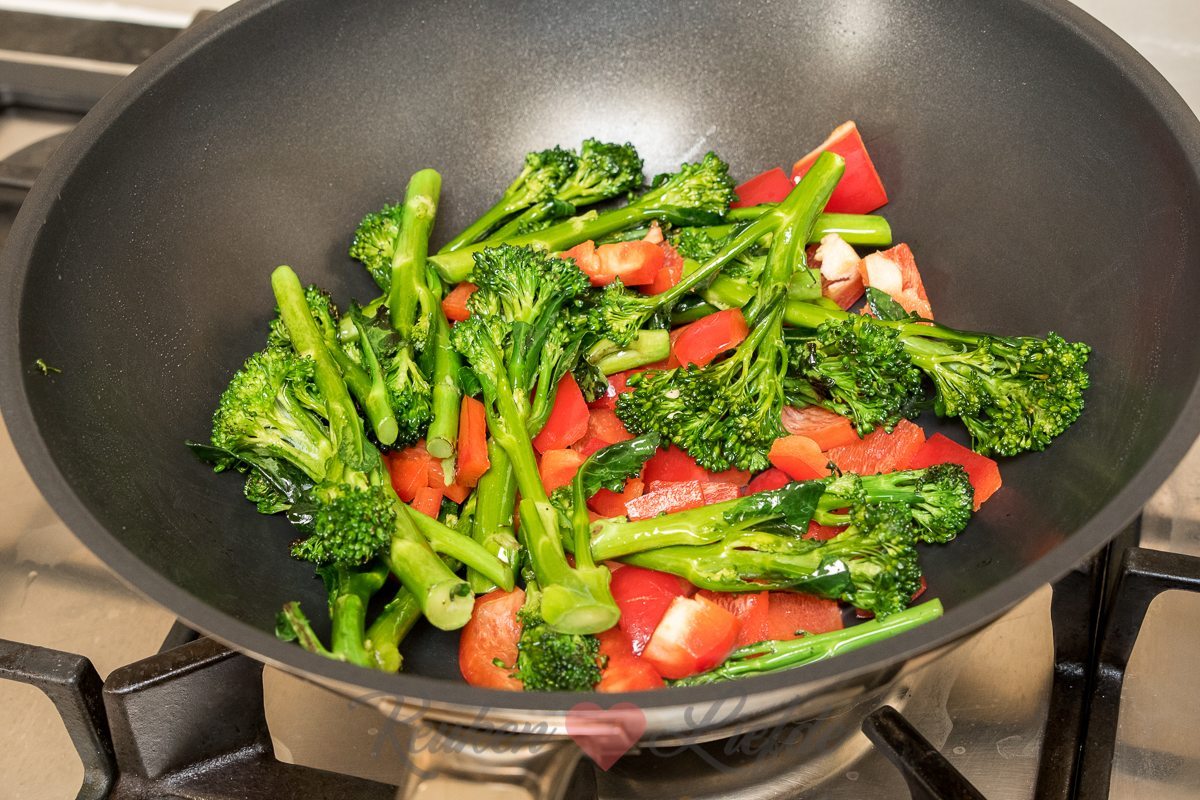 Verhit een wokpan met wat olie en laat heet worden. Voeg de entrecote toe en roerbak op hoog vuur, totdat hij half gaar is. Schep uit de pan en zet opzij. Veeg de wok schoon met keukenpapier en verhit opnieuw met wat olie. Roerbak de asperge-broccoli circa 2 tot 3 minuten op hoog vuur, of totdat hij iets zachter is. Voeg de paprika toe en wok nog 2 minuten mee. Voeg de teriyakisaus toe (verwijder de knoflook) en roerbak nog enkele minuten op hoog vuur, totdat de groenten beetgaar zijn en de saus iets is ingedikt. Voeg de entrecote samen met het vrijgekomen vleessap en de lente-ui toe en warm nog kort even door, totdat het vlees (rosé) gaar is.
