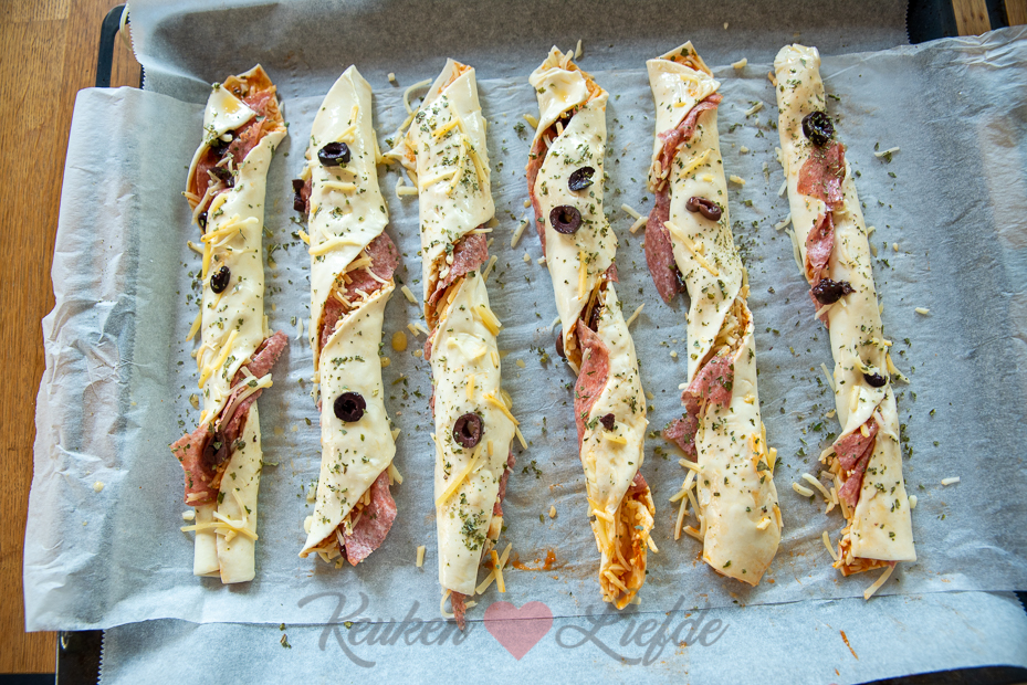 Ben jij ook zo dol op kaasstengels? Je maakt ze heel makkelijk zelf. Een lekkere variant zijn deze pizza stengels met tomatensaus, salami, kaas en olijven. Heerlijk als tussendoor snack, maar ook lekker bij een kop (tomaten)soep. Lauwwarm zijn ze het allerlekkerst. Wil je ze maken om later te eten? Piep ze dan van tevoren kort op in de oven, dan smaken ze weer als vers.