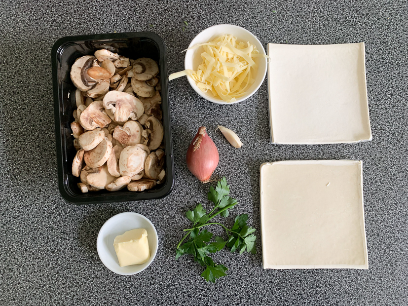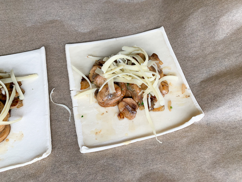 Verwijder het beschermfolie van het bladerdeeg. Schep in het midden van elk plakje bladerdeeg een bergje champignons en bestrooi met wat kaas (houd wat achter de hand). Vouw twee tegenoverliggende bladerdeegpunten over de champignons en laat ze elkaar overlappen. Druk stevig aan. Bestrooi de bovenkant met wat achtergehouden kaas. Bestrijk het bladerdeeg dun met wat water.