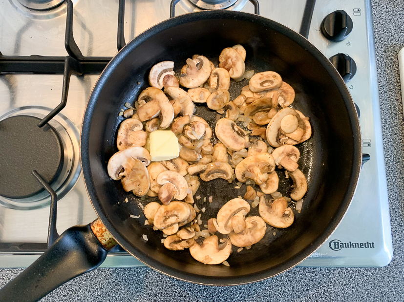 Voeg de champignons het de boter toe, bestrooi met zout en peper uit de molen en bak op hoog vuur tot het vocht uit de champignons verdampt is en ze goudbruin gekleurd zijn. Roer de helft van de peterselie door de champignons.