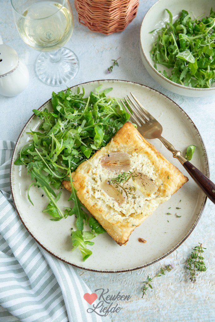Deze bladerdeeg uientaartjes met kruidenroomkaas zijn leuk en makkelijk om te maken. Met een eenvoudige salade erbij (zie hieronder) is het een heerlijk hapje om te serveren als lunch, of voorgerecht.