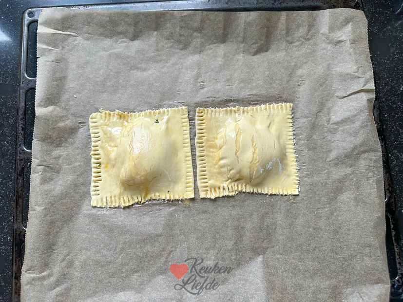 Bestrijk het bladerdeeg met ei. Schuif het bakblik in het midden van de oven en bak circa 10 minuten, of tot de bovenkant goudbruin is.