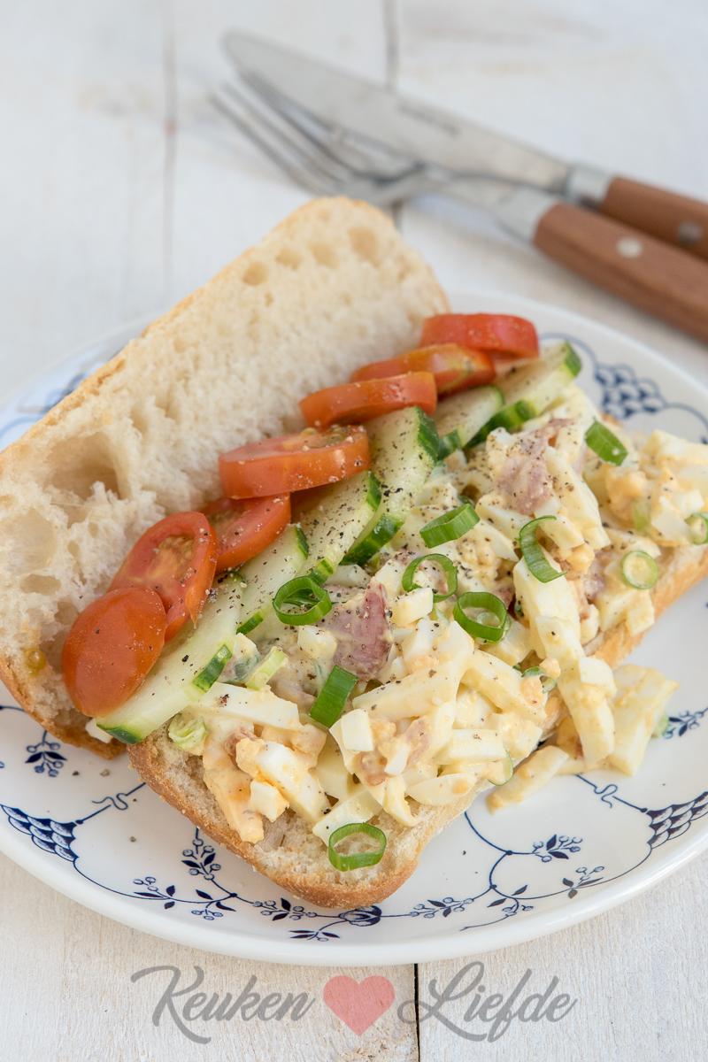 Is het al lunchtijd? Ik kan weinig leukere dingen bedenken dan uitgebreid lunchen. Ik hou ervan! Natuurlijk is buiten de deur lunchen heerlijk, maar net zoveel geniet ik van een zelfgemaakte lunch in eigen huis. Dit keer bak ik een lekker ciabatta broodje af en beleg die met zelfgemaakte eiersalade, verrijkt met knapperige bacon en frisse lente-ui.