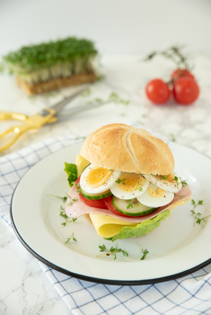 Zin in een stevige lunch? Maak een lekker broodje gezond klaar voor jezelf! Dat is zo gemaakt. Ik belegde hiervoor een vers afgebakken kaiserbroodje royaal met sla, ham, kaas, tomaat, komkommer en ei. Een flinke lik mayo op het broodje maakt het lekker smeuïg en de tuinkers maakt het af. Smullen maar!