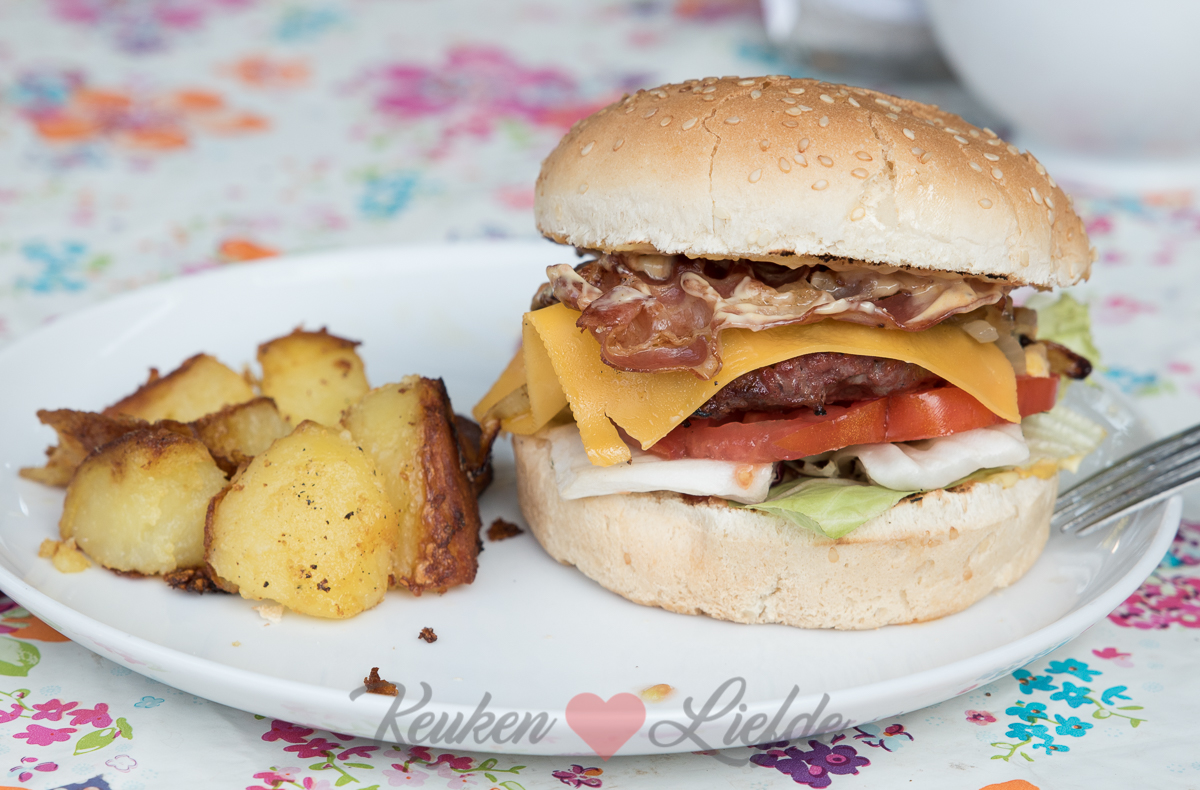 Bak de hamburgers op de barbecue, in een grillpan of in de koekenpan tot ze goudbruin en gaar zijn. Leg als de hamburgers bijna gaar zijn de kaas erop zodat deze iets kan smelten.