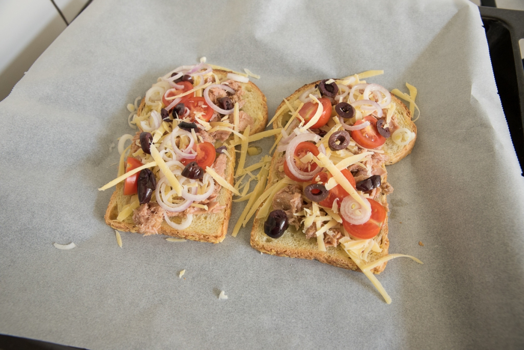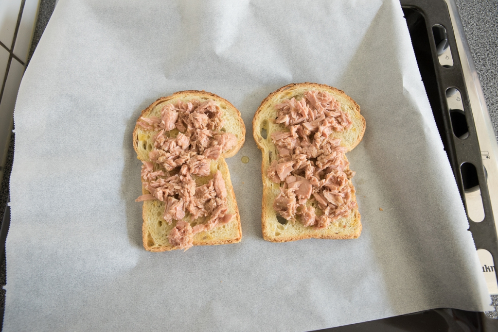 Bekleed een bakblik met bakpapier en leg het brood erop. Verdeel de tonijn uit het blikje over de twee sneetjes brood en beleg verder de overige ingrediënten. Strooi de kaas als laatste over de broodjes.