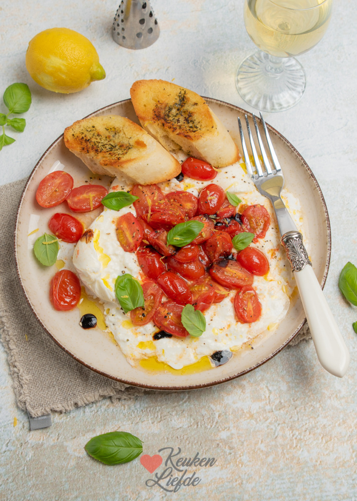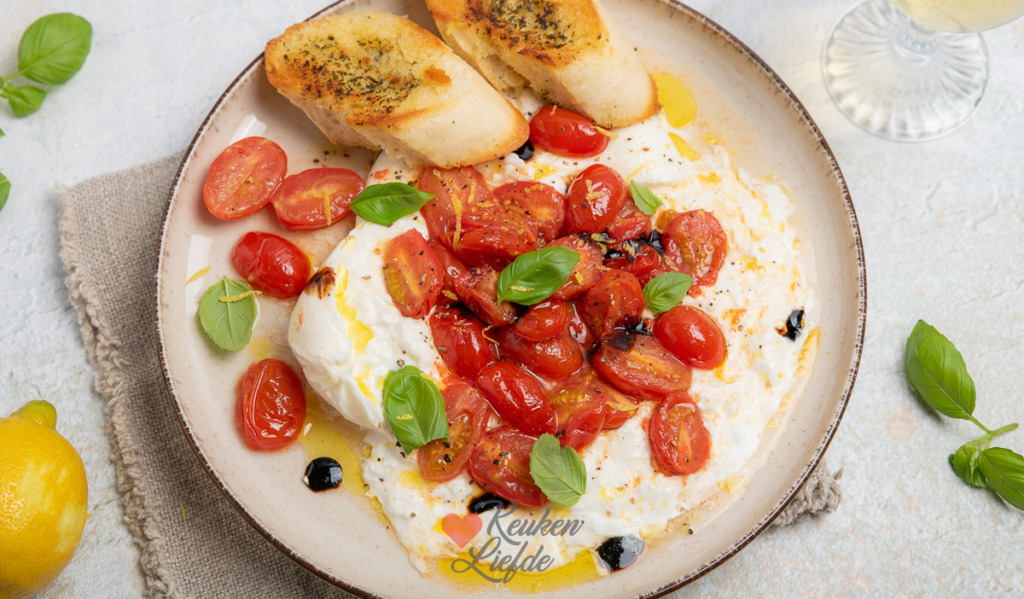 Burrata met geroosterde cherrytomaten. Een simpel maar o zo lekker hapje, lunch, of voorgerecht om te serveren op een zonnige zomerdag. Door de cherrytomaten kort te roosteren in de oven worden ze nog voller en zoeter van smaak. Een heerlijk smaakcontrast met de zachtromige burrata. Serveer met vers afgebakken stokbrood of ciabatta en geniet!