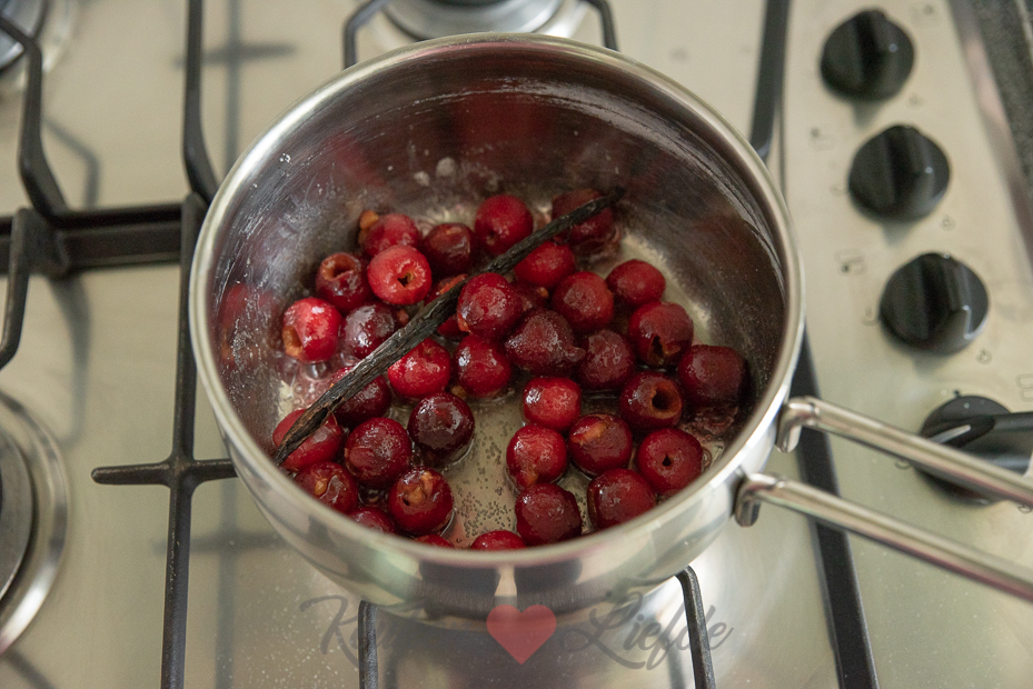 Doe de overige kersen samen met 1 à 2 eetlepels (naar eigen smaak) basterdsuiker en de uitgeholde vanillepeul in een steelpannetje. Zet het vuur hoog en kook tot de kersen hun sap loslaten en de suiker is opgelost. Laat afkoelen. Serveer de kersencompote bij de cheesecake.