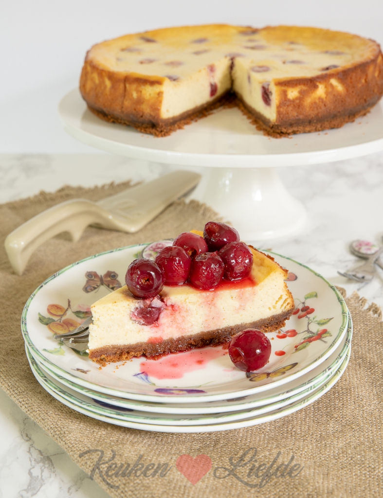 Laat de helft van de kersen goed uitlekken. Giet het beslag in de springvorm en strijk de bovenkant glad. Verdeel de kersen over de vulling en druk ze iets naar beneden zodat ze onder het beslag zitten.