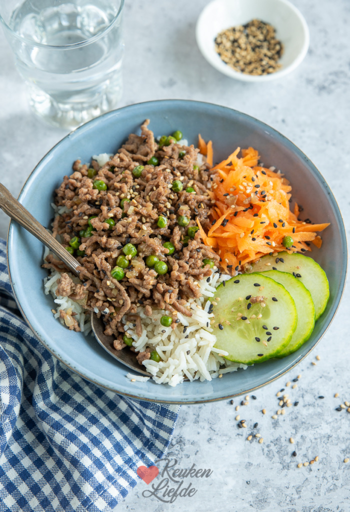 Ik serveer dit Chinees gehakt met doperwtjes graag met rijst en wat frisse rauwkost zoals geraspte wortel en komkommer. Ook radijsjes en avocado smaken hier lekker bij. Zie ook onderstaande variatietips.