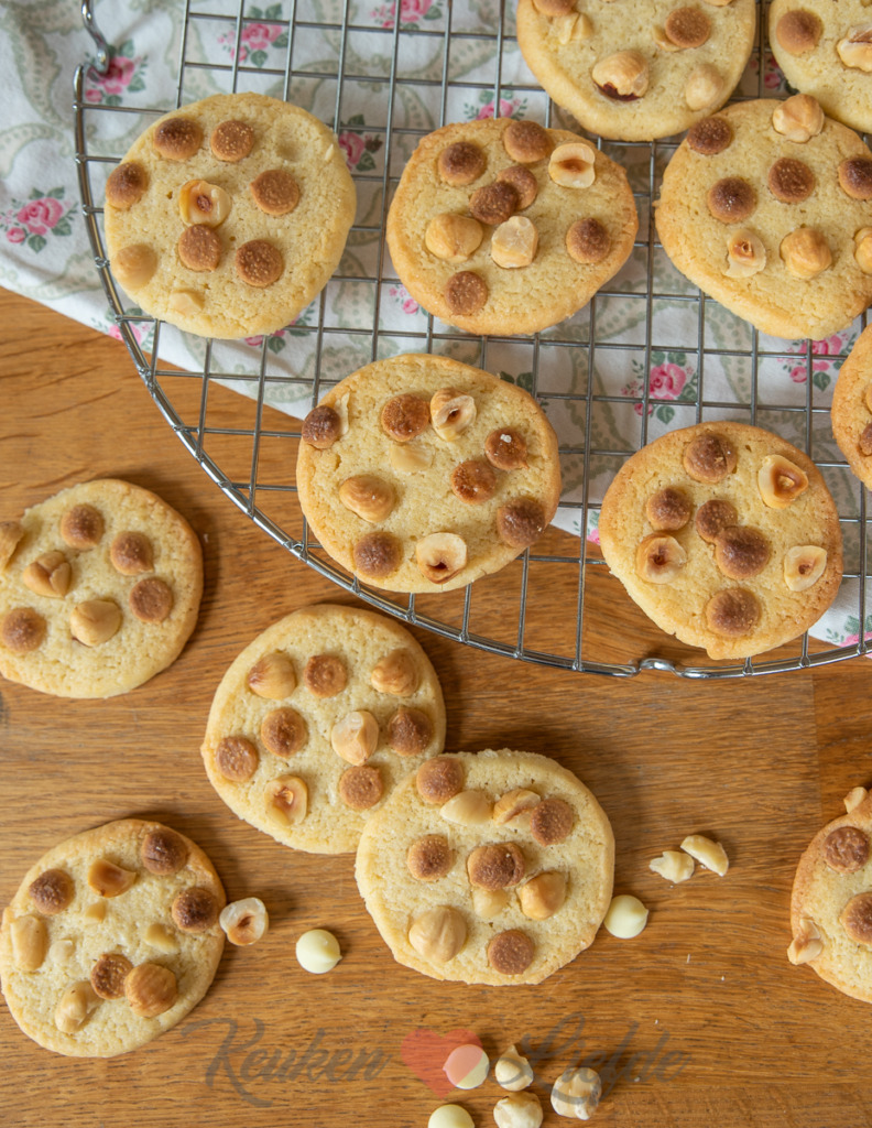 Zin om iets lekkers te bakken zonder ingewikkeld gedoe? Wij zijn dol op deze chocolate chip cookies met hazelnoot. Ze zijn makkelijk om te maken en superlekker! Je kunt ook leuke variaties maken. Zo kun je de witte chocolade bijvoorbeeld vervangen door melk- of pure chocolade en de hazelnoot vervangen door macadamia, amandel of pistache. Weet jij nog een lekkere variatie? Ik ben benieuwd!