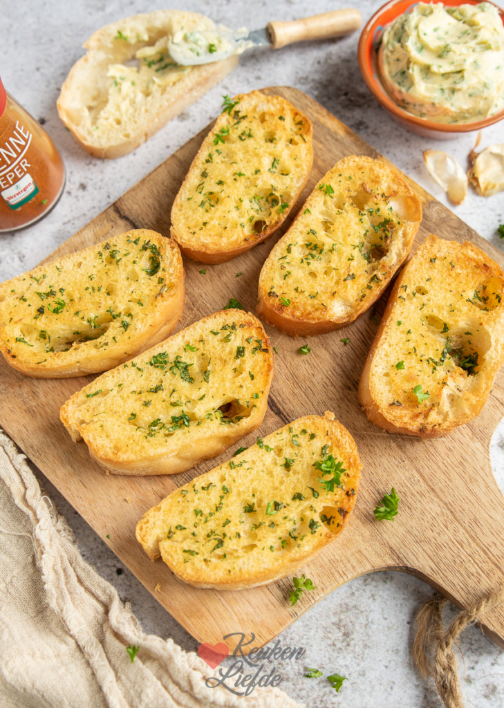 Door de knoflooktenen voor de knoflookboter vooraf te poffen in de oven verdwijnt de scherpe knoflooksmaak en worden ze zoet van smaak. Je kunt de knoflookbroodjes van tevoren al maken en bewaren in de koelkast. Voor gebruik warm je ze afgedekt met een vel aluminiumfolie weer even op in een voorverwarmde oven.