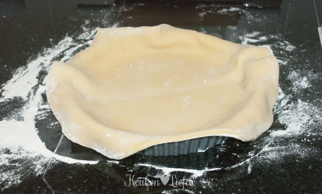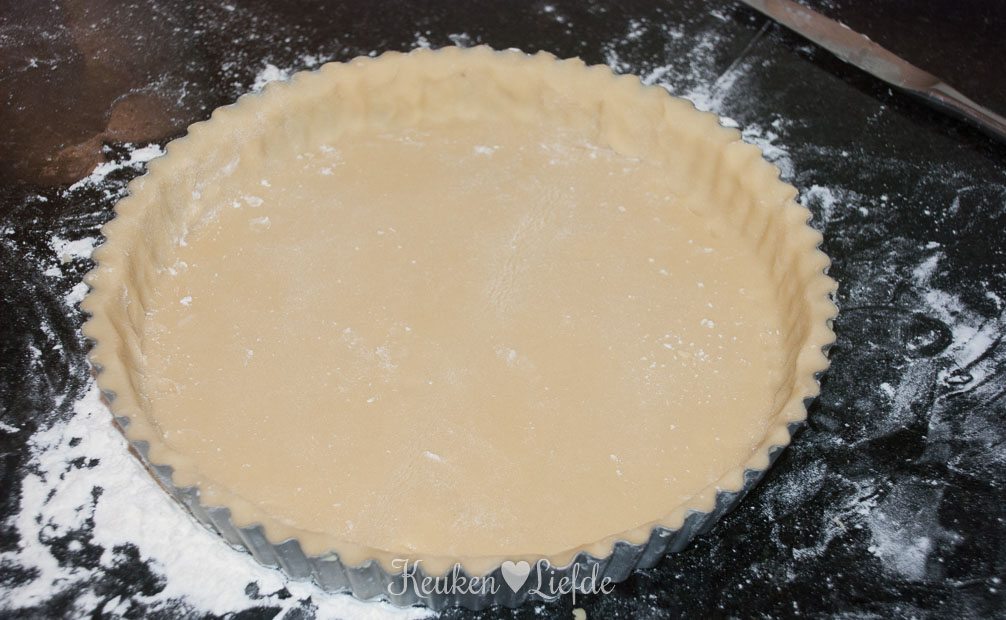 Vet de springvorm in met wat boter. Meng alle ingediënten (behalve het ei) voor de bodem door elkaar (met je handen of in de keukenmachine), totdat er zich kruimels beginnen te vormen. Voeg dan net zoveel ei toe, totdat je een gladde deegbal hebt die niet meer plakt. Plakt het deeg teveel, voeg dan wat extra bloem toe. Bestuif het aanrecht met wat bloem en rol het deeg uit, tot een ronde lap iets groter dan de springvorm. Bekleed de vorm met het deeg en druk lichtjes aan (het deeg dat je overhoudt kun je gebruiken voor een kleiner taartje of invriezen en later gebruiken). Prik met een vork gaatjes in de bodem en zet de vorm in de vriezer.