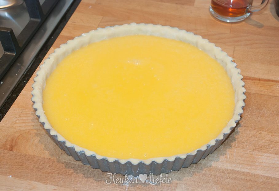 Verwarm de oven voor op 180 graden. Voeg de custardpoeder, kristalsuiker, citroensap en rasp en 300 ml water in een kookpan en verhit al roerend op laag vuur. Roer net zolang totdat alle klontjes verdwenen zijn en het mengsel begint te binden (niet laten koken!). Zet het vuur uit en voeg de boter toe. Roer net zolang, totdat de boter is opgenomen en voeg dan, al roerend, de eidooiers toe. Haal de bodem weer uit de vriezer en schenk de lemon curd eroverheen.