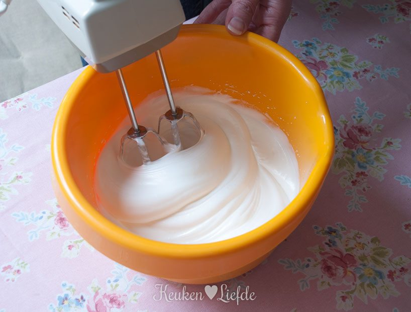 Klop de eiwitten samen met de suiker tot stijve pieken (voeg de suiker pas na enkele minuten kloppen, geleidelijk toe aan de eiwitten).
