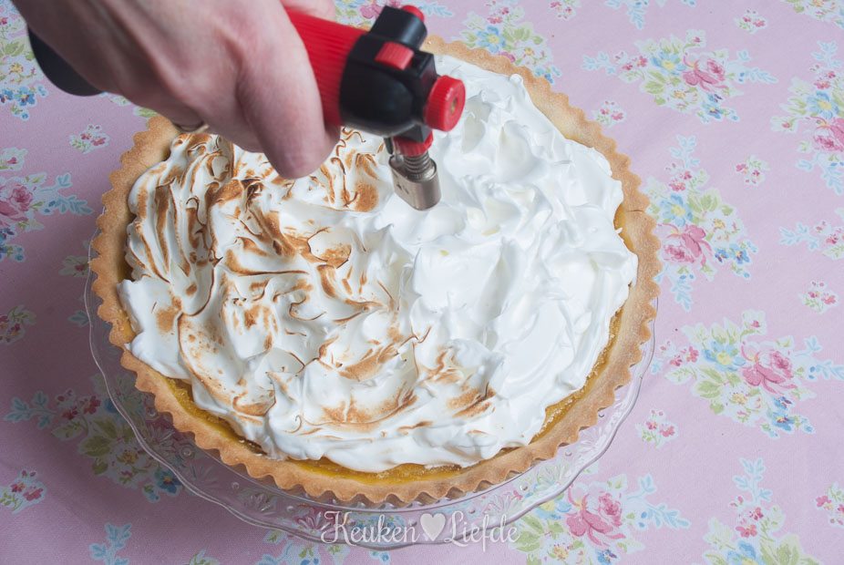 Schep het meringueschuim op de citroentaart en trek met de achterkant van een lepel pieken in het schuim. Brand met een gasbrander, totdat de pieken goudbruin kleuren.