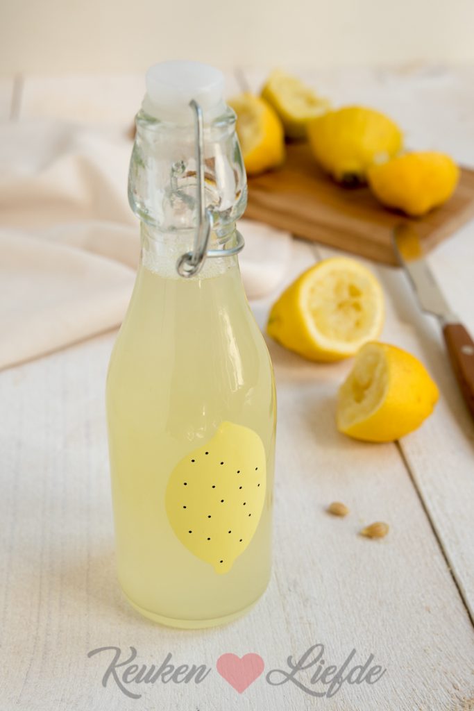 Met dit recept kun je precies één flesje vullen met heerlijke citroenlimonade. Vul een glas met wat ijs en een bodempje van deze citroenlimonade en vul af met koud water. Genieten maar!