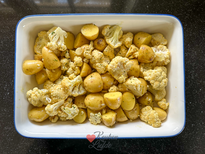 Doe de krieltjes, bloemkool, de helft van de peterselie, helft van de kerriepoeder en 3 eetlepels olijfolie in een kom en hussel om met zout en peper. Verdeel over een grote ovenschaal met een heel klein bodempje water, dek af met folie en bak 30 minuten in het midden van de oven tot de aardappel gaar is. Verwijder de laatste 10 minuten van de oventijd het alufolie en voeg de paprika en rode ui toe (op de foto zie je de paprika en ui bij de kip maar omdat ze niet helemaal gaar werden, heb ik dat hier in de bereiding aangepast). Bak nog 10 minuten verder zodat de bloemkool en krieltjes een beetje kleuren en het vocht verdampt is.