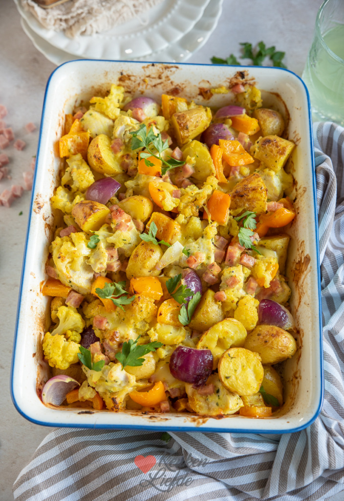 Een heerlijke cordon bleu ovenschotel met verse krieltjes, kipfilet, bloemkool, ham en kaas. Lekker op smaak gebracht met kerrie en romige crème fraîche.