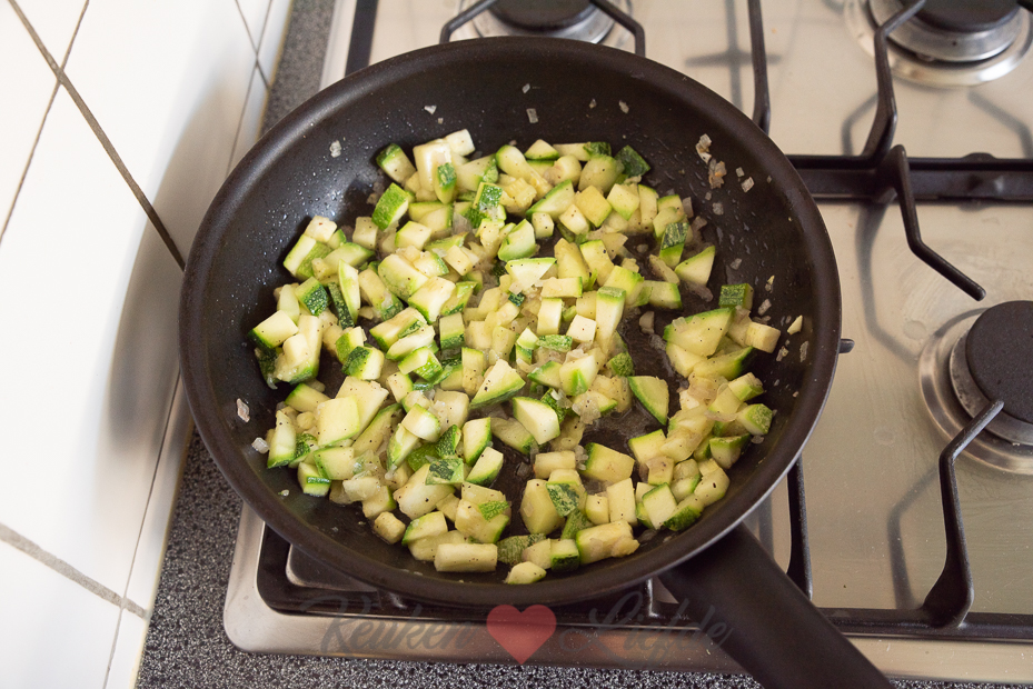 Verhit een koekenpan met de olijfolie. Voeg de ui en knoflook toe en fruit op middelhoog vuur tot de ui zacht is. Voeg de courgette toe en bak op middelhoog verder tot de courgette zacht is en begint te kleuren.