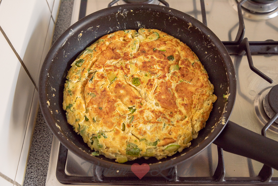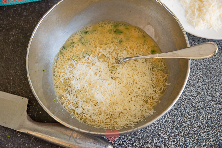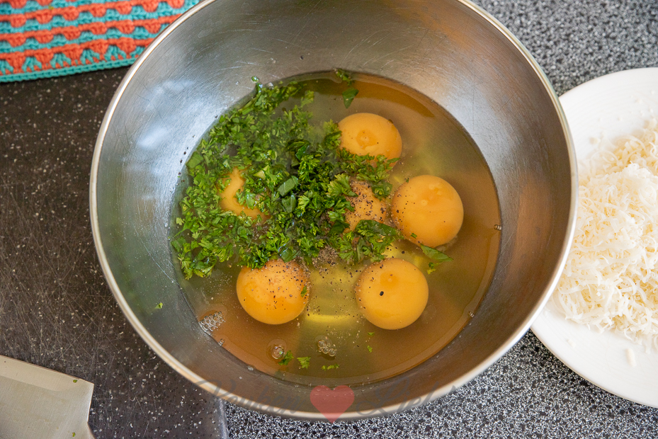 Klop in een kom de eieren los met de parmezaan (houd wat achter voor garnering), peterselie en basilicum. Breng op smaak met zout en peper. Schenk het eimengsel over de courgette in de koekenpan. Roer voorzichtig met een bakspatel over de bodem en duw steeds de randen los. Roer niet te hard, anders krijg je roerei. Stop met roeren zodra het eimengsel begint te stollen. Doe de deksel op de pan en laat de frittata in ca. 7 minuten op heel laag vuur stollen.