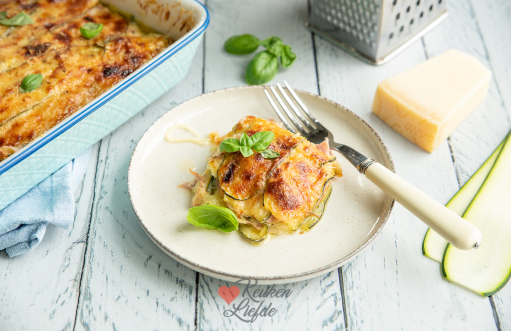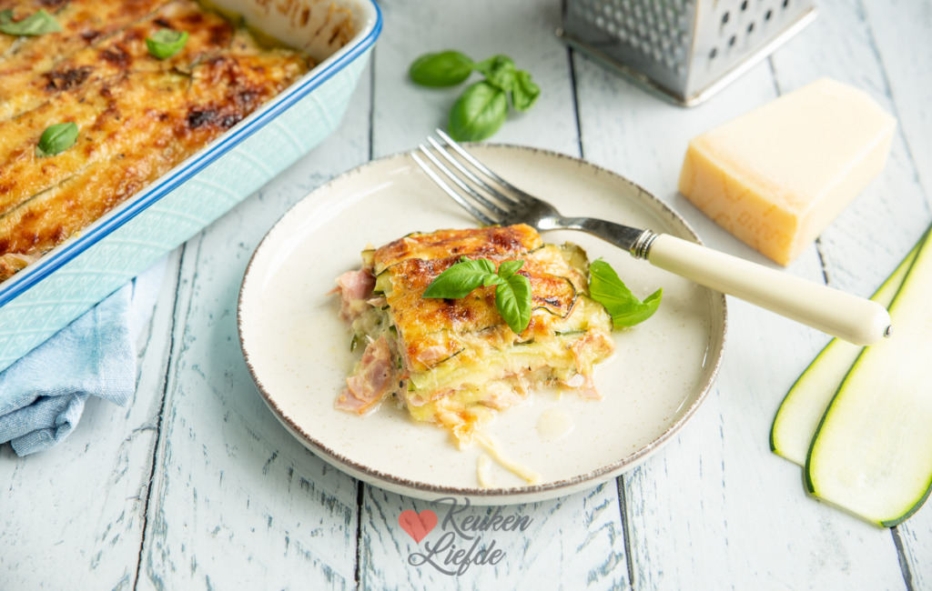 Courgette lasagne met ham en mozzarella. Ik ben dol op lasagne en dit is een leuke variant op de klassieker. Elk jaar hebben wij courgettes uit eigen moestuin en iedereen die een courgetteplantje heeft weet, die dingen groeien als onkruid. Deze lasagne met courgette, ham en mozzarella maak ik graag in de zomer om het overschot aan courgettes in te verwerken. De traditionele lasagnebladen vervang je door dunne courgetteplakken waardoor het tevens een koolhydraatarm recept is. De courgettes gaan rauw de ovenschaal in en garen in de oven. De voorbereiding is zo gepiept. Daarna doet de oven de rest van het werk.