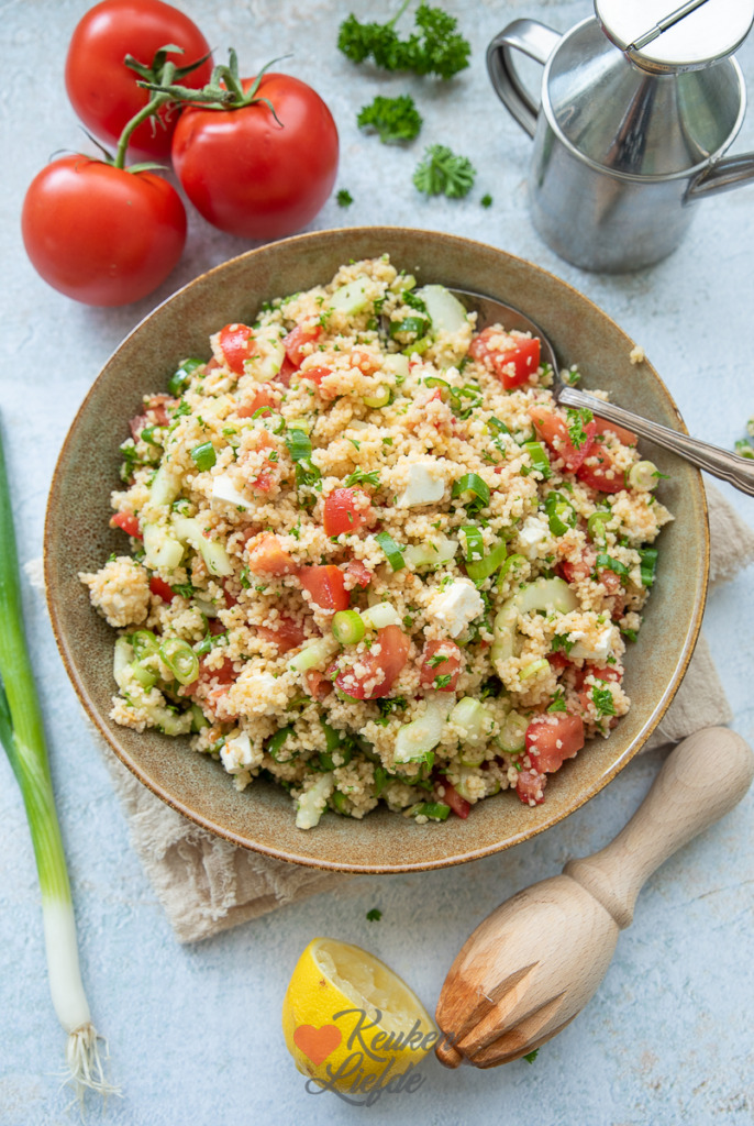 Couscous is een fijn ingrediënt om op voorraad te hebben in je kelderkast. Met enkele verse ingrediënten uit de koelkast erbij zet je in een handomdraai een lekker gerecht op tafel. Deze couscoussalade met feta, tomaat, komkommer, lente-ui en peterselie is lekker fris van smaak en makkelijk om te maken. Serveer hem als bijgerecht bij de barbecue, of neem hem mee naar je werk als lunch.