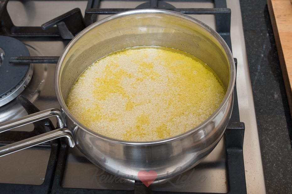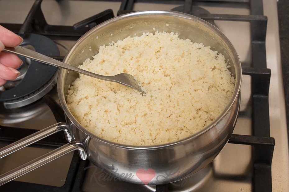 Breng 400 ml water aan de kook met een snuf zout. Voeg 3 el olijfolie en de couscous toe en roer door. Zet het vuur uit en dek de pan af. Laat 5 minuten staan.