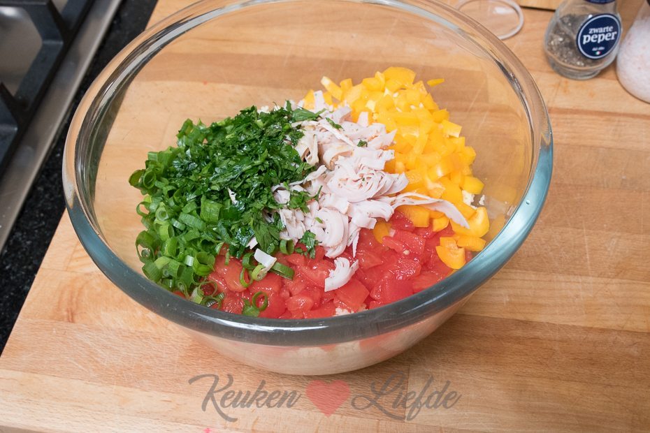 - 125 g kalkoen- of kipfilet (vleeswaren)