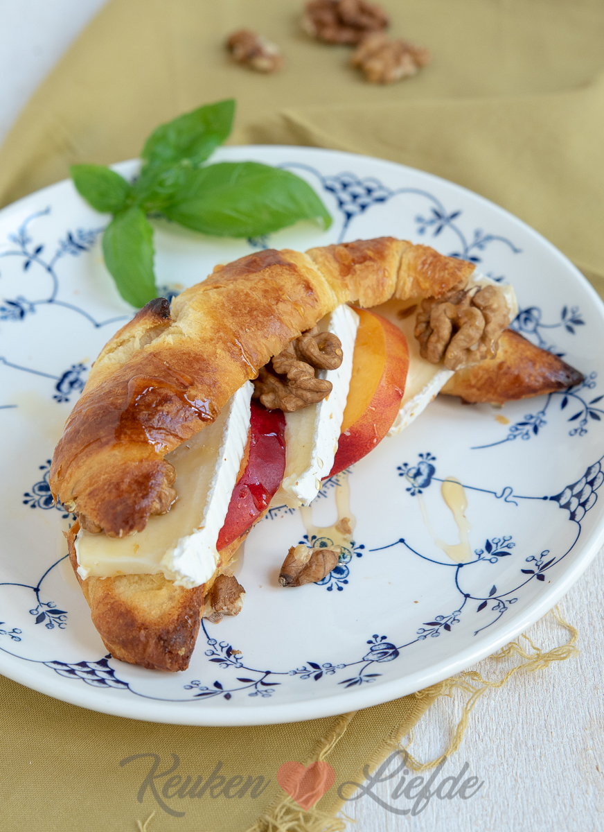 Geef mij een kop koffie en een verse croissant voor het ontbijt en ik ben een gelukkig mens. Maar net zo blij word ik van een lekkere lunch. Waar het ’s ochtends simpel mag, pak ik tijdens de lunch iets meer uit. Deze croissant met romige brie, knapperige walnoot en zoete nectarine en honing zijn een perfecte match. Een aanrader voor de lunch en supermakkelijk om te maken!