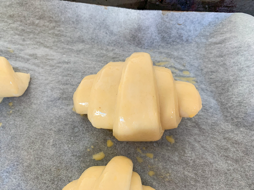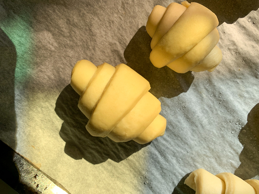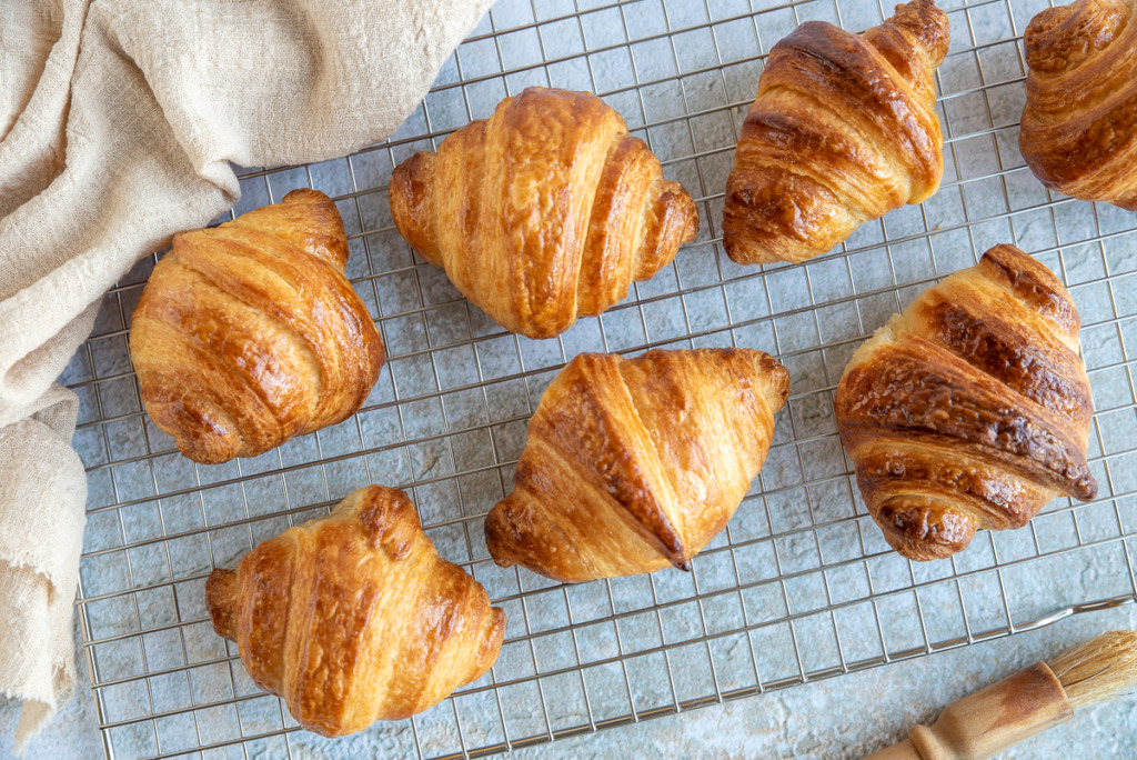 Het croissantdeeg (pâte à croissant) in dit recept wordt door Petit Gâteau ook gebruikt om chocoladebroodjes (pains au chocolat) van te maken. Van de afsnijdsels maken ze weer koffiebroodjes met rozijnen of chocolade.