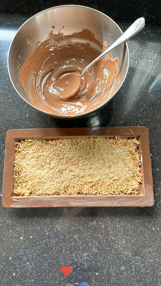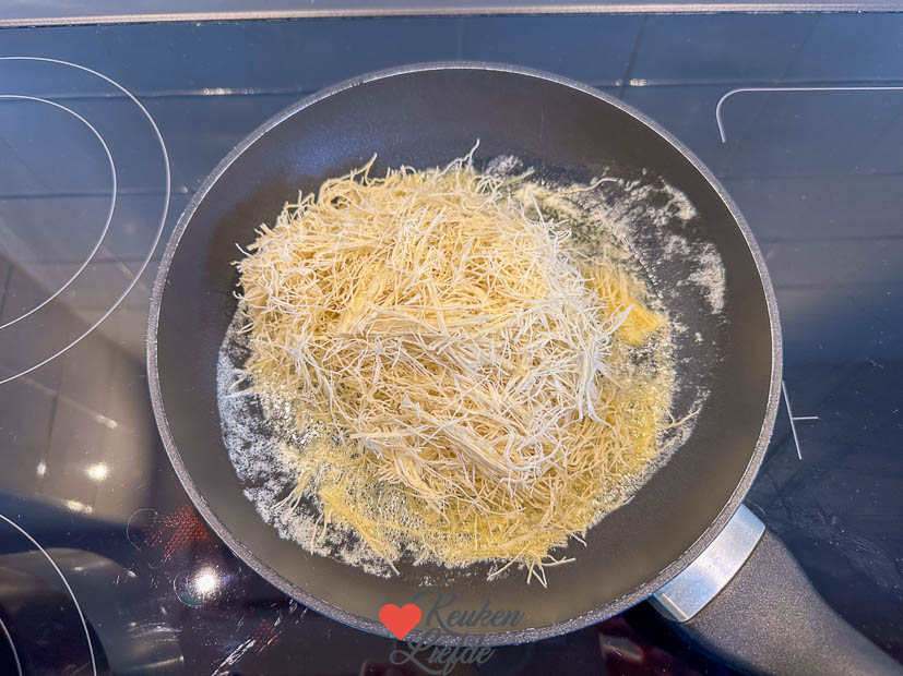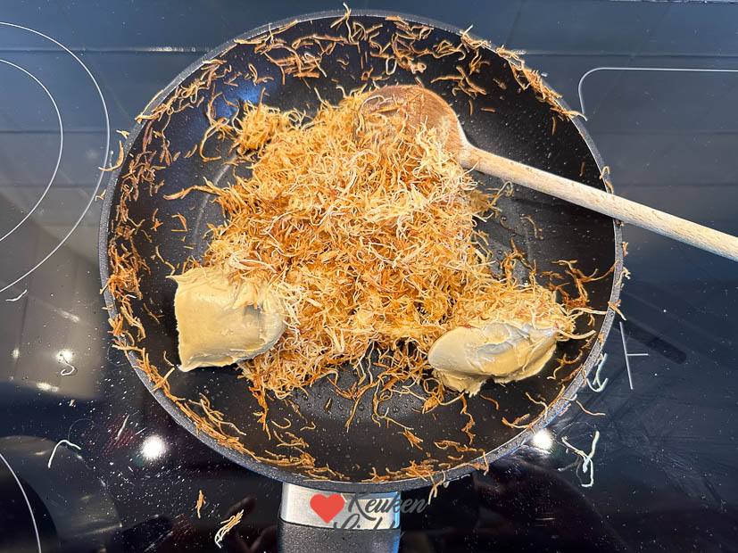 De vulling van de Dubai reep bestaat uit kadayif (dunne deegslierten) en pistachepasta. Soms wordt er ook tahin (sesampasta) toegevoegd maar die heb ik achterwege gelaten en ook niet gemist. Kadayif vind je in de koeling bij de Turkse winkel of supermarkt. Je bakt ze krokant en goudbruin in wat boter in de koekenpan en mengt er pistachepasta doorheen. Klaar is je vulling!