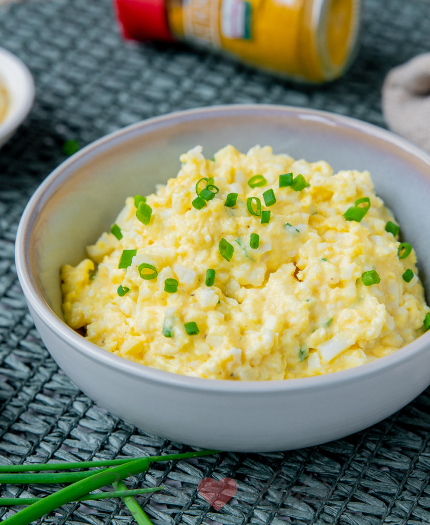 Een eenvoudig basisrecept voor zelfgemaakte eiersalade met een vleugje kerrie en bieslook. Heerlijk bij de borrel op een toastje of stokbroodje, of op een broodje als lunchgerecht.