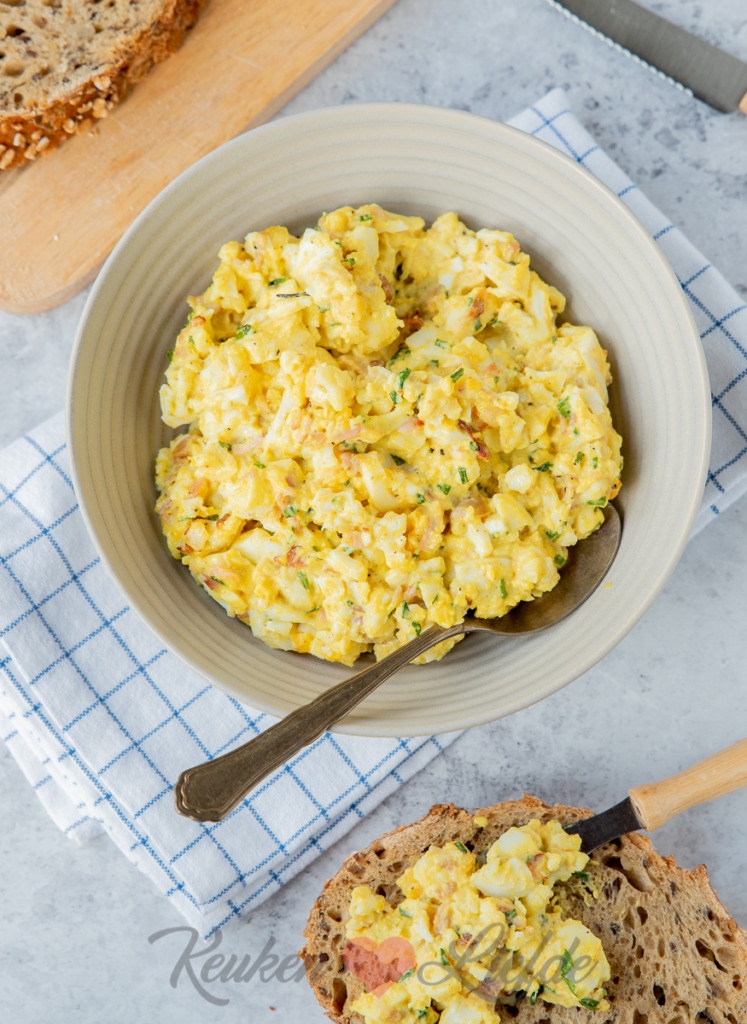 Een zelfgemaakte eiersalade is gemaakt in een handomdraai. Heerlijk op een toastje bij de borrel, of tijdens de lunch op een broodje. Deze eiersalade met bacon, ui en frisse augurk is heerlijk van smaak en een van onze favorieten!