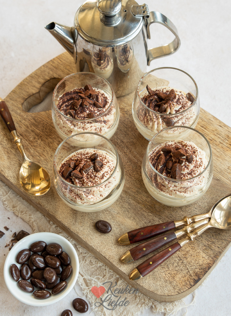 Dit heerlijke dessert is bedacht in Italië. De Italianen noemen het crema al caffè wat zoveel betekent als koffieroom. De bereiding is supersimpel. Je maakt het door gezoete en afgekoelde espresso te mengen met slagroom en deze luchtig te kloppen. Spuit of lepel de mousse in een mooi glas, garneer met wat cacaopoeder en mokkaboontjes, en finito!