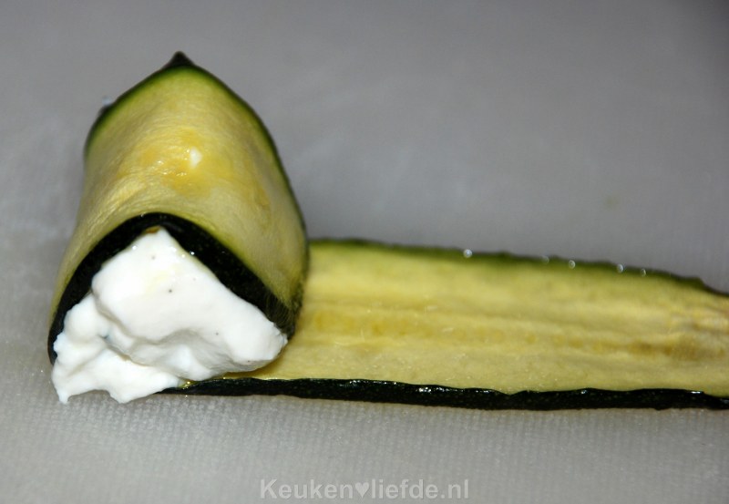 Het originele recept voor deze rolletjes is van Gordon Ramsay, waar hij kleine courgettes rauw verwerkt in dit hapje. Kleine courgettes kun je rauw verwerken omdat ze veel smaakvoller, en minder waterig, zijn dan de grotere variant. Helaas kon ik dit keer alleen grote courgettes vinden, en dus heb ik de courgettelinten eerst geroosterd in de oven om ze wat meer smaak te geven. Ze smaken heerlijk!