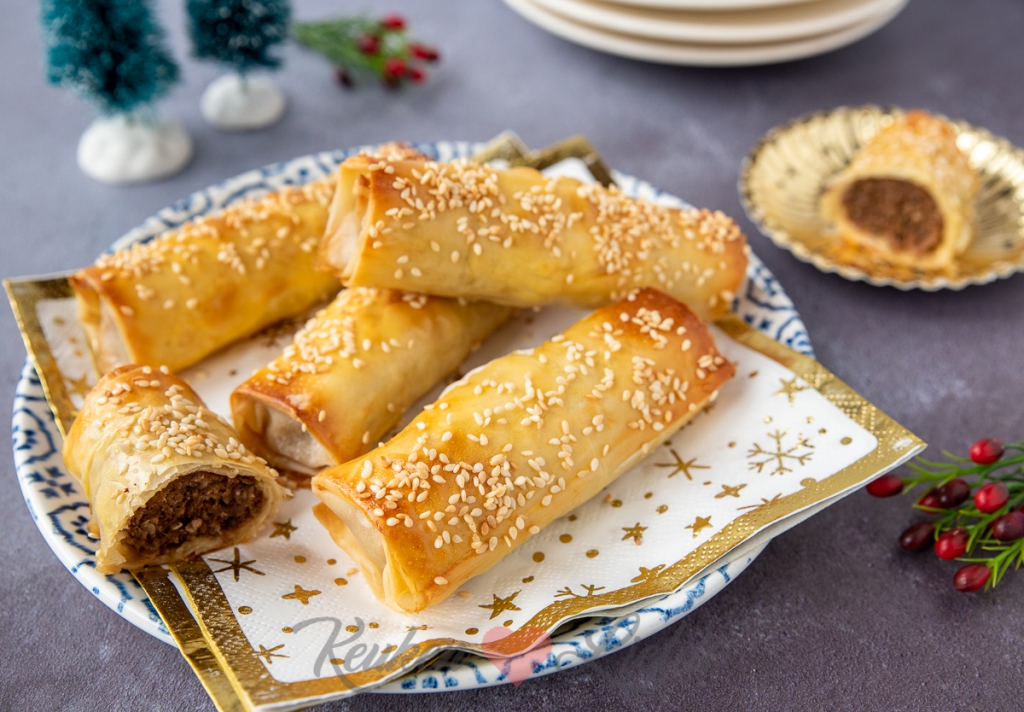 Leg een vel filodeeg neer (bewaar het andere filodeeg onder een vochtige theedoek) en kwast de randen in met eidooier. Voeg indien nodig een klein beetje water toe aan de eidooier om hem iets vloeibaarder te maken. Leg onderaan het vel filodeeg een rolletje gehakt, houd wat ruimte aan de zijkanten en de onderkant vrij. Vouw eerst de zijkanten van het filodeeg over de uiteindes van het gehakt en rol dan strak op tot een rolletje. Leg met de vouw naar beneden op het bakblik. (Wil je de filodeegrolletjes bewaren om later af te bakken dan kun je ze nu afgedekt bewaren in de koelkast of vriezer.)