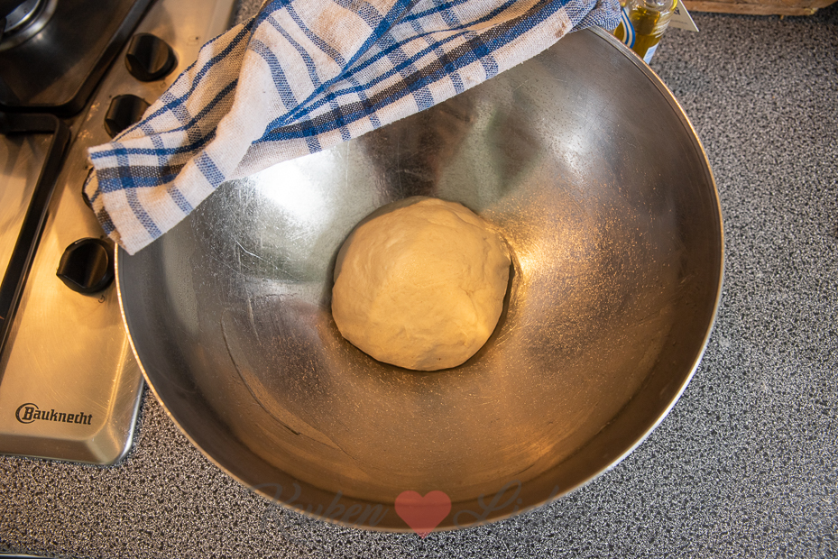 Roer in een kom de bloem, gist, suiker en zout door elkaar. Voeg het water en de olijfolie toe en kneed met de deeghaken van de mixer of keukenmachine tot een samenhangend en soepel deeg dat loslaat van de wanden. Vorm met je handen een bal van het deeg en leg in een ingevette kom. Dek de kom af met een vochtige theedoek en laat het deeg circa 1 uur rijzen op een warme plek. Het deeg zal dan in volume verdubbeld zijn.