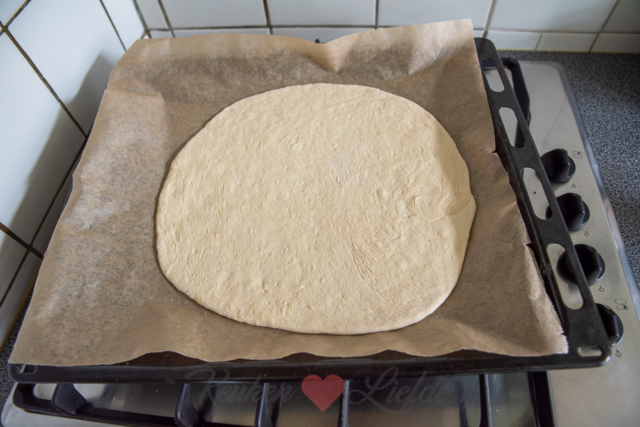 Stort het deeg op een licht met bloem bestoven werkblad en rol dun uit tot een ronde lap. Leg de ronde deegbodem op het bakblik. Je kunt het deeg eventueel ook verdelen in twee bollen en de deegbodems op twee kleinere bakblikken bakken.