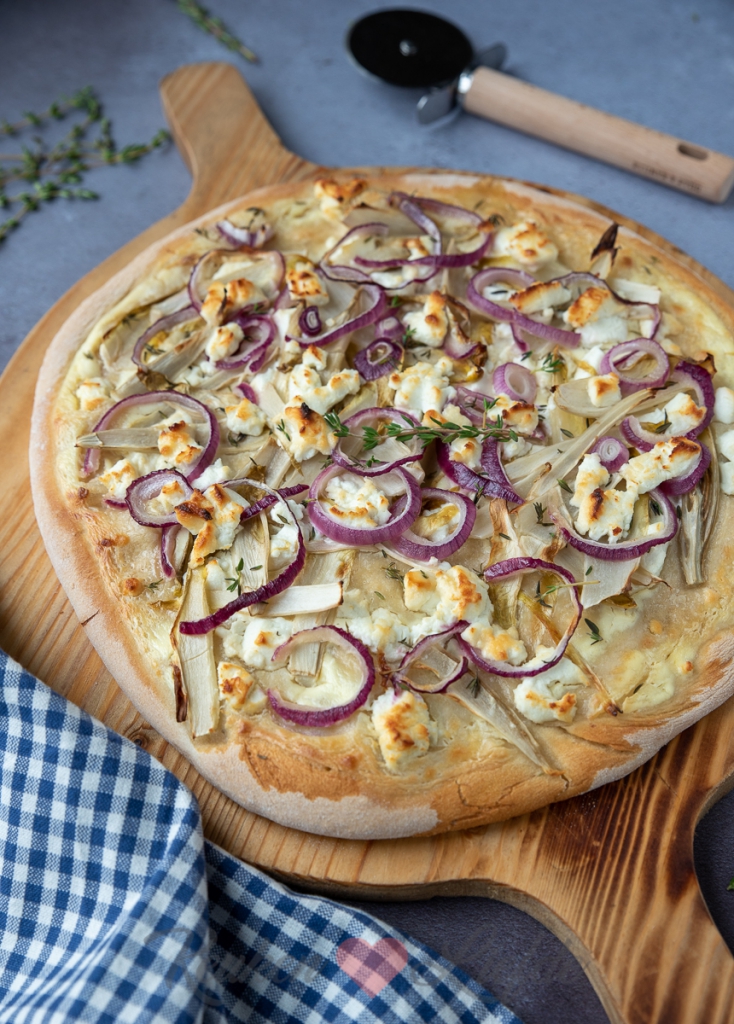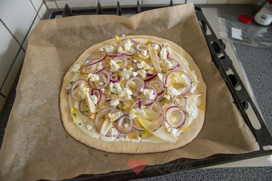 Bestrijk de deegbodem dun met een laag crème fraîche. Beleg de flammkuchen met de verkruimelde geitenkaas, reepjes witlof, rode ui en tijmblaadjes. Drizzle wat honing over de flammkuchen.