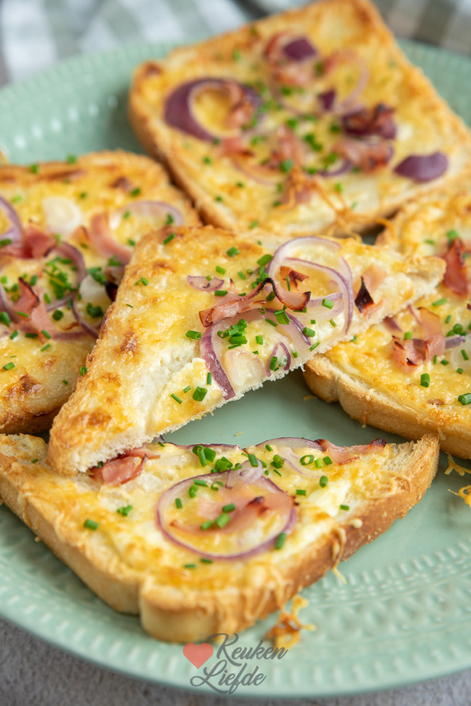 Een leuke en snelle variant op de Duitse flammkuchen is deze flammkuchen toast. Lekker als lunch, tussendoor snack, of serveer met een lekkere kom soep erbij als avondeten. Je kunt het brood ook in vieren snijden en de flammkuchen toast als borrelhapje serveren.