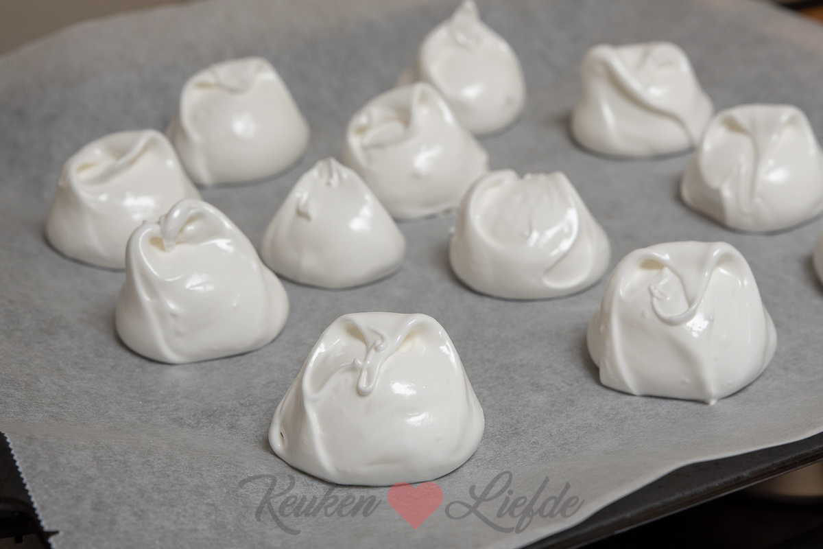 De meringues zullen na 2 uur drogen in de oven hard van buiten en nog zacht vanbinnen zijn. Vind je het lekker als ook de binnenkant hard is laat de meringues dan 2,5 tot 3 uur drogen in de oven.
