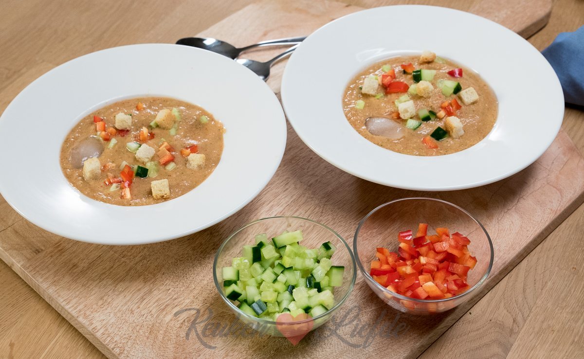 Nooit gedacht dat ik koude soep zo lekker zou vinden, maar deze gazpacho is natuurlijk niet voor niks een Spaanse klassieker. Gazpacho is een dikke soep die koud geserveerd wordt. Hij wordt gemaakt van rauwe tomaat, komkommer, ui, paprika en brood die samen in de blender tot een gladde soep gepureerd worden. Supermakkelijk om te maken dus! 🙂