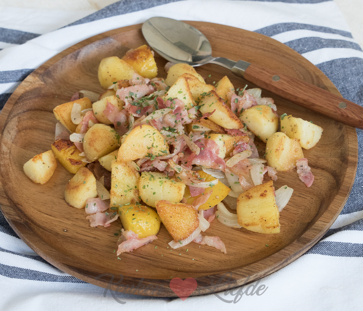Wij Verweij’tjes zijn niet echt grote aardappeleters, maar deze gebakken aardappels met spek en ui zet ik regelmatig op tafel. We zijn er allemaal dol op. Soms voeg ik op het laatste moment ook nog een eitje toe en laat die meegaren tussen de aardappels. Lekker met wat gekookte groenten erbij of een goedgevulde groene salade.