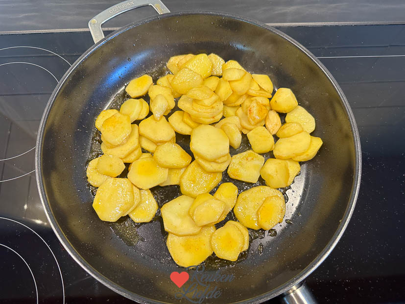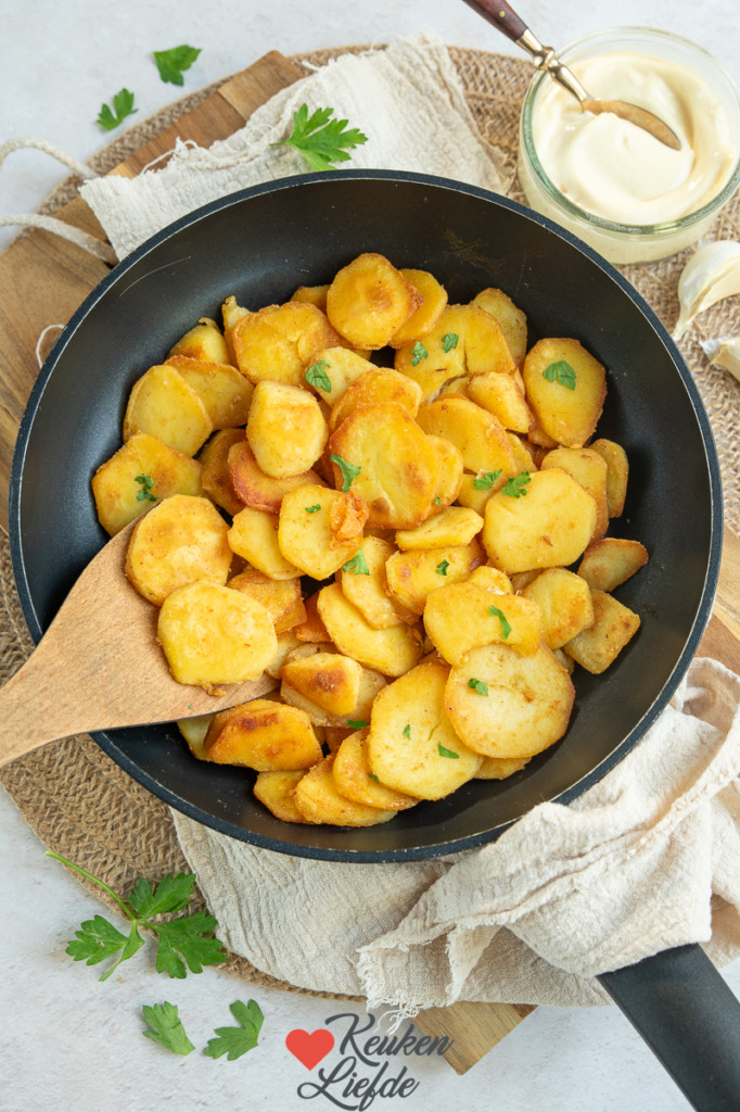 De lekkerste gebakken aardappels maak je met een restje gekookte aardappels van de dag ervoor. Je hoeft ze dan alleen in plakjes te snijden voordat je ze bakt in de koekenpan. Je kunt de aardappels ook schillen, in plakjes of blokjes snijden en dan even voorkoken. Afhankelijk van de dikte hoef je ze maar 5 minuten te koken, of tot ze beetgaar zijn. Laat ze goed uitlekken en volledig afkoelen. Als de aardappels koud zijn kun je ze krokanter bakken en vallen ze minder snel uit elkaar tijdens het bakken.