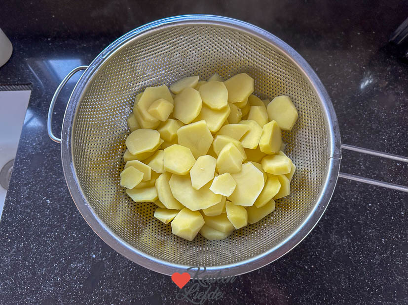 Koop een zak ‘stamppot-aardappelen’, die zijn al geschild en voorgekookt, en snij ze in wat kleinere blokjes. De grootste ‘brokken’ uit de zak ongeveer in 4-en.