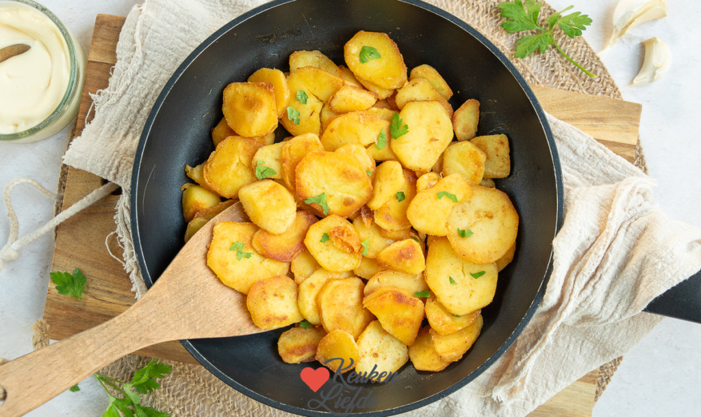 Wil je gebakken aardappels met een lekker krokant korstje? Dep de aardappelschijfjes indien nodig droog en gebruik een grote koekenpan zodat ze alle ruimte hebben, of bak in meerdere porties. Laat de olie of bakboter goed heet worden voordat je de aardappels in de pan doet. Bak de aardappels op middelhoog vuur aan beide kanten goudbruin.