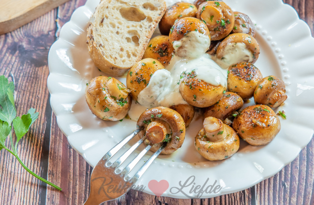 - 400 g (kleine) champigons, schoongeborsteld en steeltjes eraf gesneden