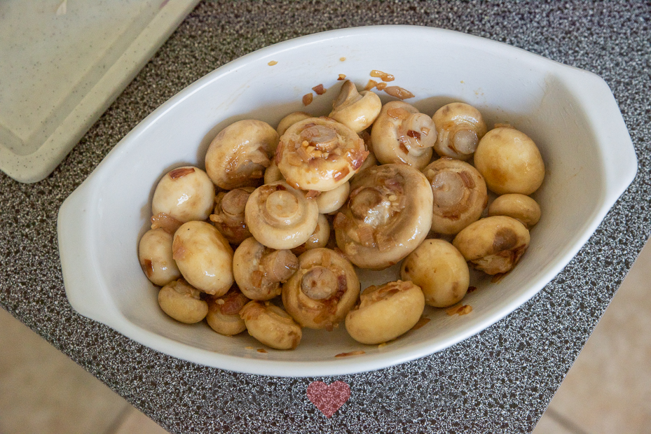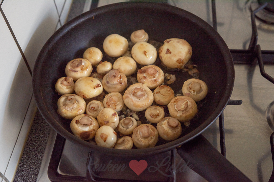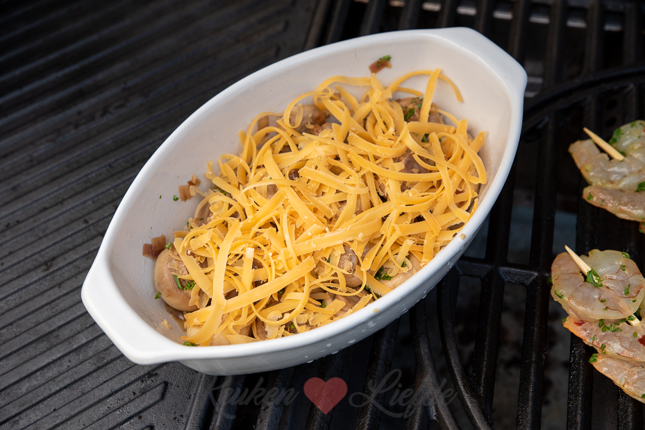 De champignons worden eerst even aangebakken met een sjalotje en wat knoflook en daarna afgeblust met witte wijn. Dan mogen ze in een ovenschaaltje (of aluminium barbecueschaaltje als je ze op de barbecue bereid) en bestrooi je ze met geraspte kaas. Even gratineren in de oven of op de barbecue en dan, smullen maar!