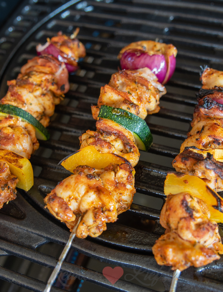 Heerlijk gekruide kipspiezen van de barbecue met courgette, paprika en ui. Voor het lekkerste resultaat gebruik ik kipdijfilet omdat die lekker mals en sappig blijven op de barbecue. Ik kruid de kip met mijn zelfgemaakte kip- of cajunkruiden (afhankelijk waar ik op dat moment zin in heb). Als je weinig tijd hebt volstaat 15 minuten marineren, maar een uurtje is nog beter. Dan kan de smaak lekker in de kip trekken. Je kunt de spiezen van tevoren al maken en afgedekt in de koelkast leggen tot je ze gaat grillen. Lekker met geroosterde aardappeltjes en groenten van de barbecue (recept ga ik nog delen).